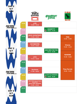 AAAMYYY / Chanaz / DJ KOCO aka SHIMOKITA / Hide / Kick a Show [DJ] / LITE / never young beach / NIKO NIKO TAN TAN / NUNOME / ONE PARK Special Band powered by SOIL&”PIMP”SESSIONS / レキシ / RHYMESTER / Suchmos / Theo Parrish / ZEN-LA-ROCK a.k.a. COMBINATE FUTURE [DJ]